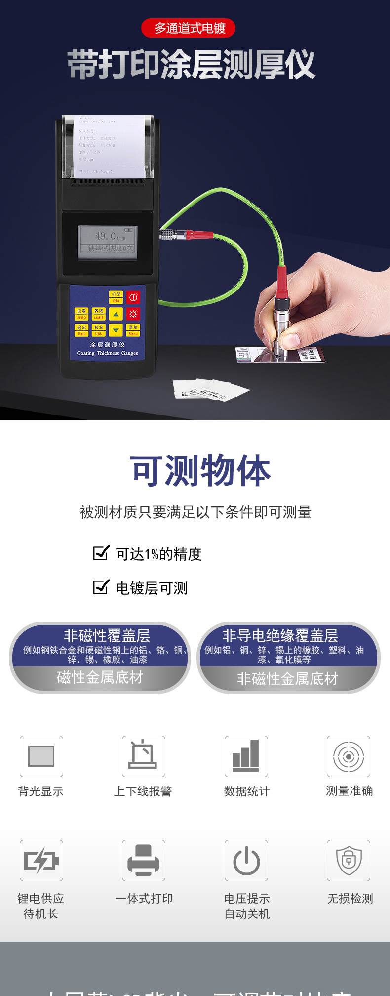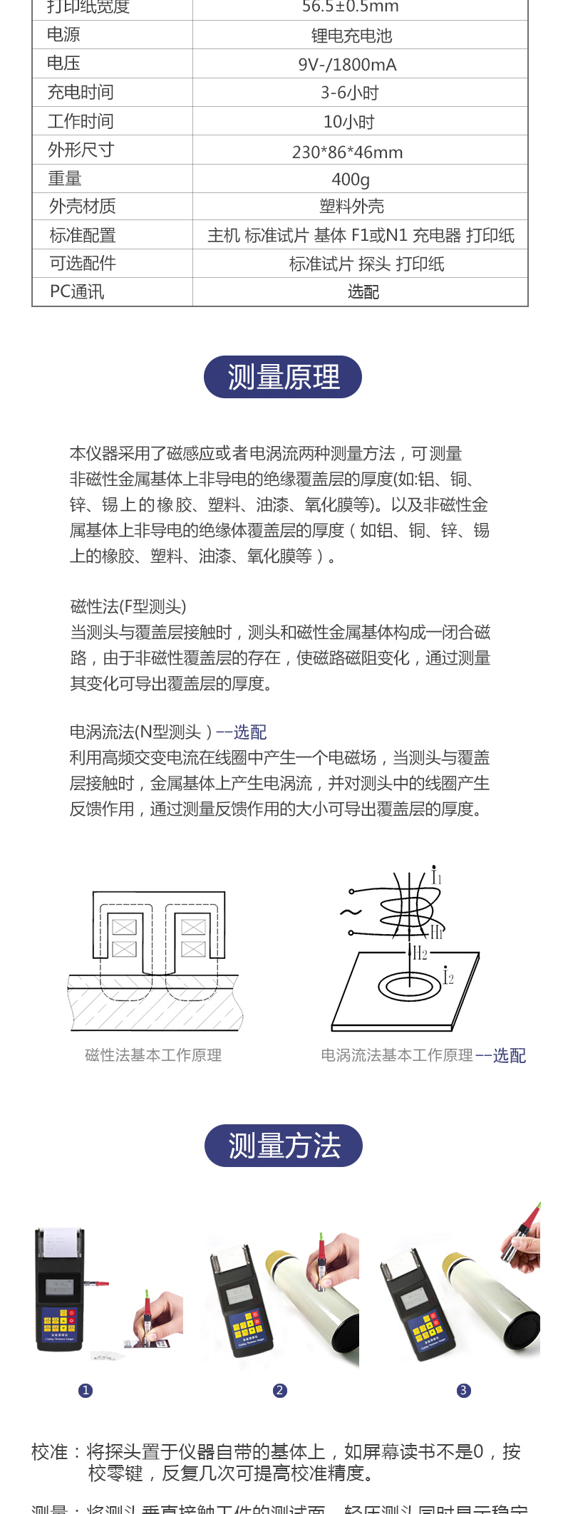采用磁性和電渦流兩種測量方法,可檢測磁性金屬基體上非磁性覆蓋層的厚度(如鋼、鐵、合金和硬磁性鋼上的鋁、鉻、銅、鋅、錫、橡膠、油漆等),以及非磁性金屬基體上非導電的絕緣覆蓋層的厚度(如鋁、銅、鋅、錫上的橡膠、塑料、油漆、氧化膜等)。