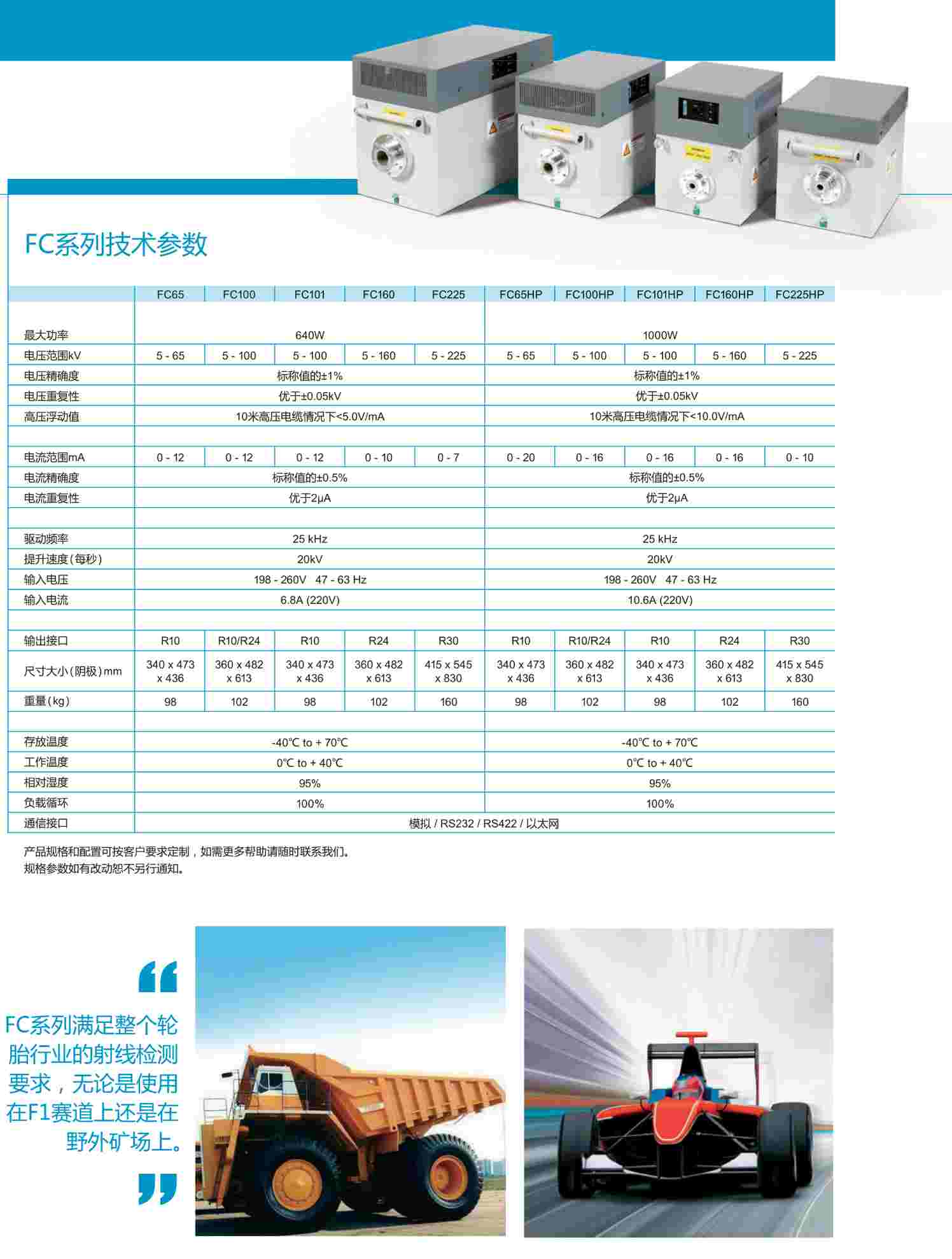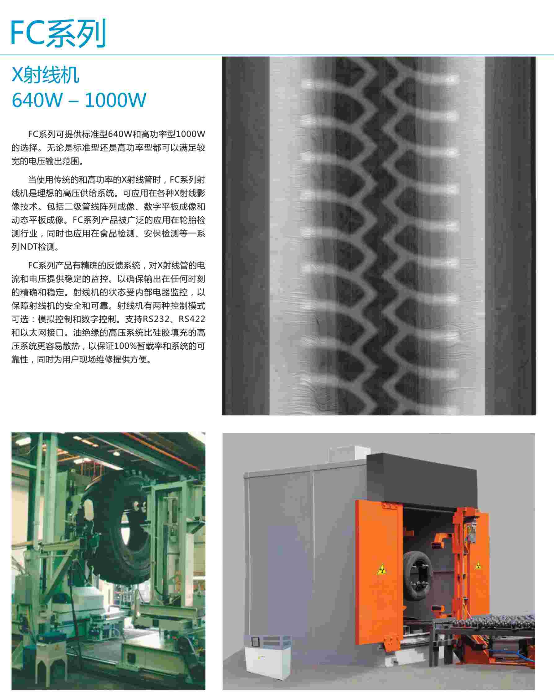 當(dāng)使用傳統(tǒng)的和高功率的X射線管時(shí),F(xiàn)C系列射線機(jī)是理想的高壓供給系統(tǒng)。可應(yīng)用在各種X射線影像技術(shù)。包括二極管線陣列成像、數(shù)字平板成像和動(dòng)態(tài)平板成像。FC系列產(chǎn)品被廣泛的應(yīng)用在輪胎檢測(cè)行業(yè),同時(shí)也應(yīng)用在食品檢測(cè)、安保檢測(cè)等一系列NDT檢測(cè)。