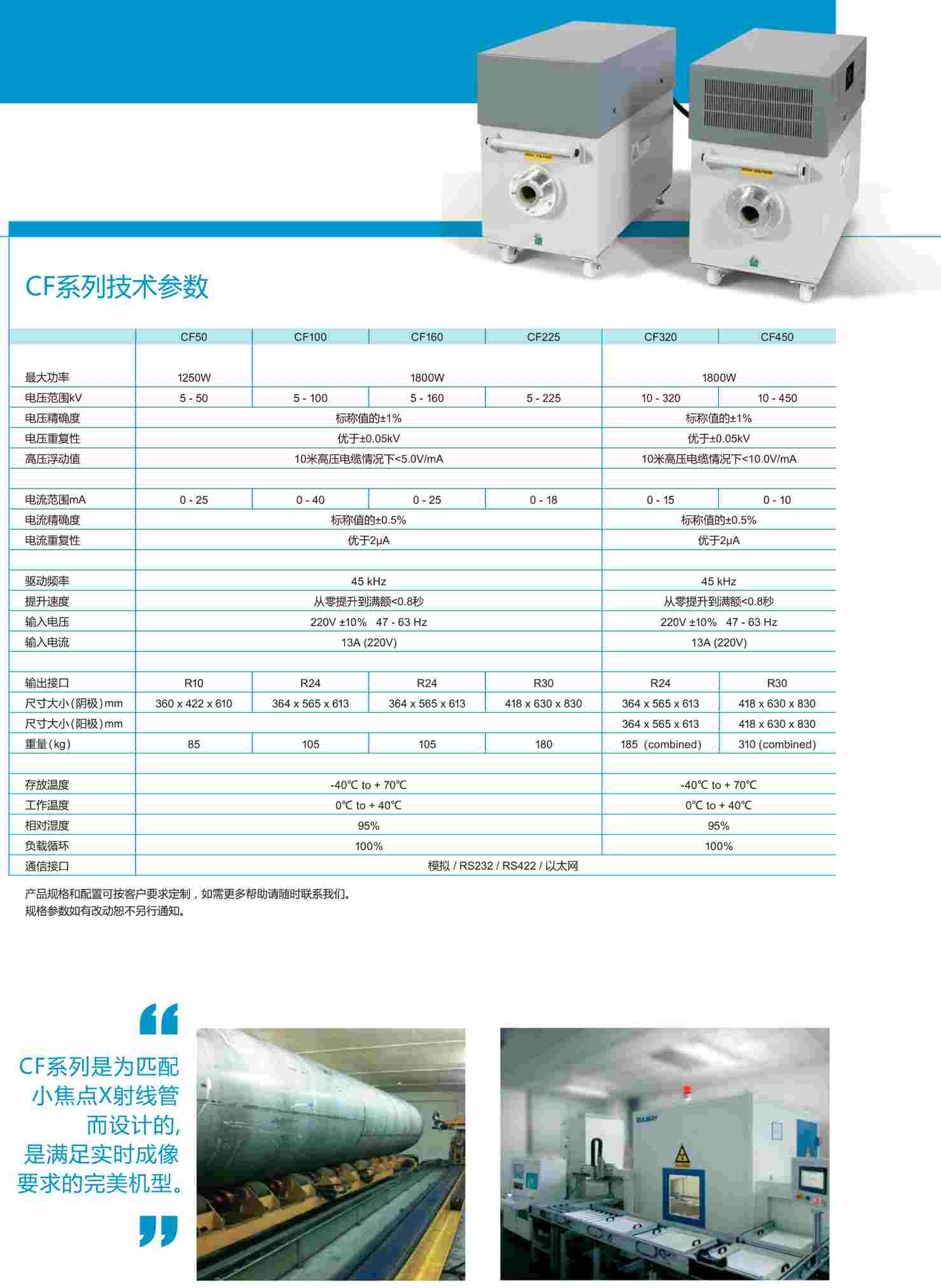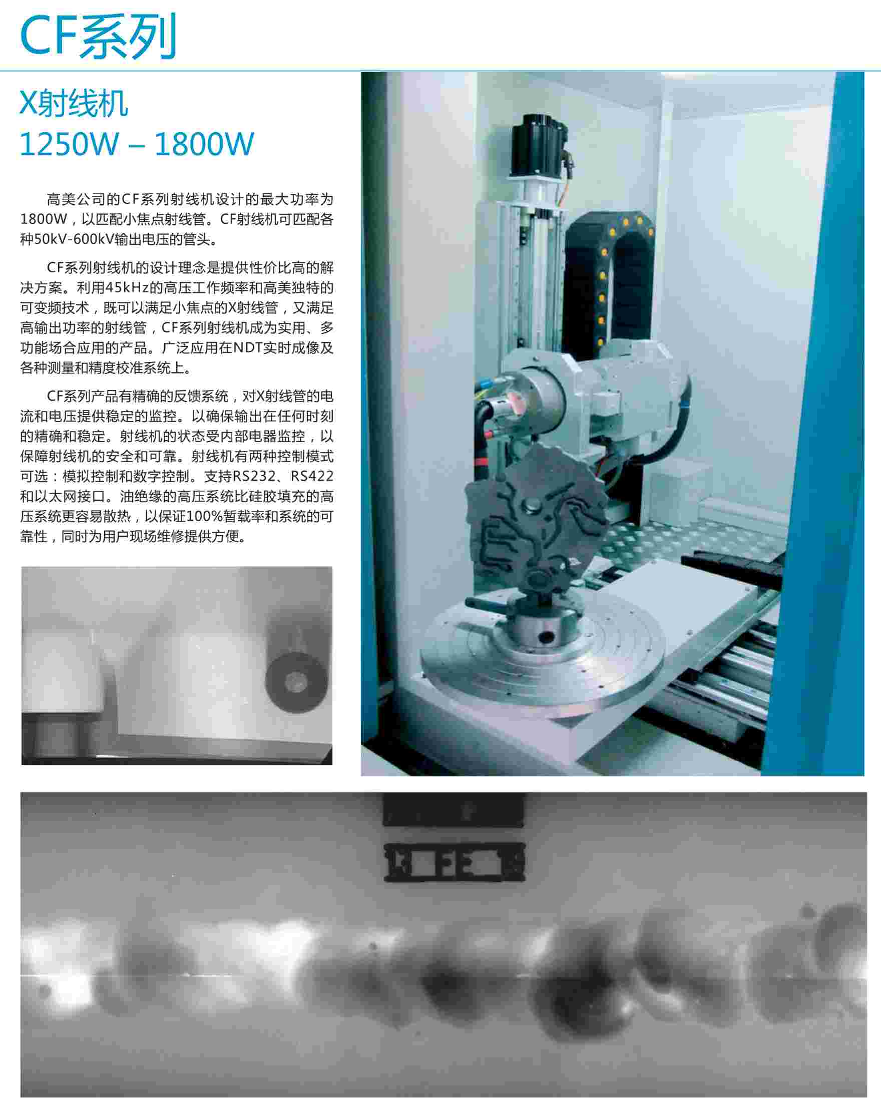 高美公司的CF系列射線(xiàn)機(jī)設(shè)計(jì)的最大功率為1800W,以匹配小焦點(diǎn)射線(xiàn)管。CF射線(xiàn)機(jī)可匹配各種50kv-600kv輸出電壓的管頭。