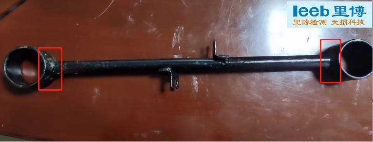 此工件是汽車底盤的一個零部件,需要檢測角接接頭焊縫內(nèi)的缺陷;檢測此類工件,推薦使用K1的斜探頭,從圓環(huán)上對角接接頭焊縫進行探傷,因為從圓環(huán)進行探傷,不會出現(xiàn)焊角的干擾回波,而在棒材上使用K2探頭探傷時,會出現(xiàn)焊角回波的影響,增加操作者判定缺陷回波的難度,從而影響缺陷的判定。而探頭放在圓環(huán)上進行檢測時,如果發(fā)現(xiàn)回波較高,就是缺陷波;這樣,對于探傷初學者來說,更容易檢測判斷;此工件,可以直接導入探傷方案進行探測,做到快速探傷;因此,同類生產(chǎn)汽車底盤零部件的相關行業(yè)都可以推薦此超聲探測方案進行探傷。