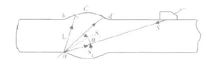 如圖4 所示, 當(dāng)超聲波主聲速方向與焊角處輪廓法線方向之夾角α小于第三臨界角αⅢ時(shí), 界面處除反射1 個(gè)橫波S2 外, 還會(huì)產(chǎn)生1 個(gè)變型縱波L。當(dāng)α遠(yuǎn)小于αⅢ時(shí), 變型縱波L 會(huì)射至c、b 等處, 相應(yīng)地, 反射橫波S2 會(huì)射至c、d 等處, 這些地方的輪廓法線方向與聲波入射方向相同或相近, 因此會(huì)在示波屏上產(chǎn)生2 個(gè)反射回波, 即L 與S2。另外, 由于α較小, 入射聲速S 的一部分會(huì)直接由焊角處返回探頭, 形成焊角回波S1。這樣, S1、S2 與L 波形成1 個(gè)如漢字“山”形的回波群, 故稱“山形回波”。
