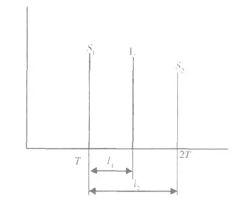2.2.1 如圖4 所示, “山形回波”中L 波與S2 波聲程相近, 但L 波為變型縱波, 而縱波聲速遠(yuǎn)大于橫波聲速, 所以在熒屏上L 波落在S2 波之前。以鋼焊縫為例, 其縱波聲速CL=5 900 m/s, 橫波聲速CS=3 230 m/s, 設(shè)L 波與S2 波聲程相等, 則l1/l2=CS/CL=0.55(l1、l2 見(jiàn)圖5), 即在熒光屏上, L 波位于S1 與S2 波之間距的0.55 倍處( 與S1 的距離) 。而S2 波在熒屏上的具體位置則與定位方法有關(guān)。設(shè)S2 波的實(shí)際聲程為SⅡ, 則:
