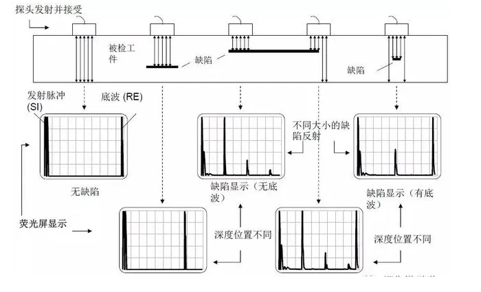 反射法利用的是超聲波的反射特性,即超聲波在由一種介種介質(zhì)的過程中,在兩介質(zhì)的交界面處會發(fā)生反射,且介質(zhì)間差別越大反射程度也會越大?;谶@種原理,在對物體缺陷進(jìn)行檢測時(shí),可以先對物體發(fā)射超聲波,然后對反射回來的超聲波進(jìn)行接收,通過對比所發(fā)射的與接受到的超聲波的異同即可判定物體的內(nèi)部結(jié)構(gòu),其是否含有缺陷,缺陷屬于哪種類型,處于什么位置等等。