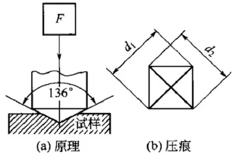 維氏硬度測量原理與布氏硬度相似。采用相對面夾角為136°金剛石正四棱錐壓頭,以規(guī)定的試驗力F壓入材料的表面,保持規(guī)定時間后卸除試驗力,用正四校錐壓痕單位表面積上所受的平均壓力表示硬度值。