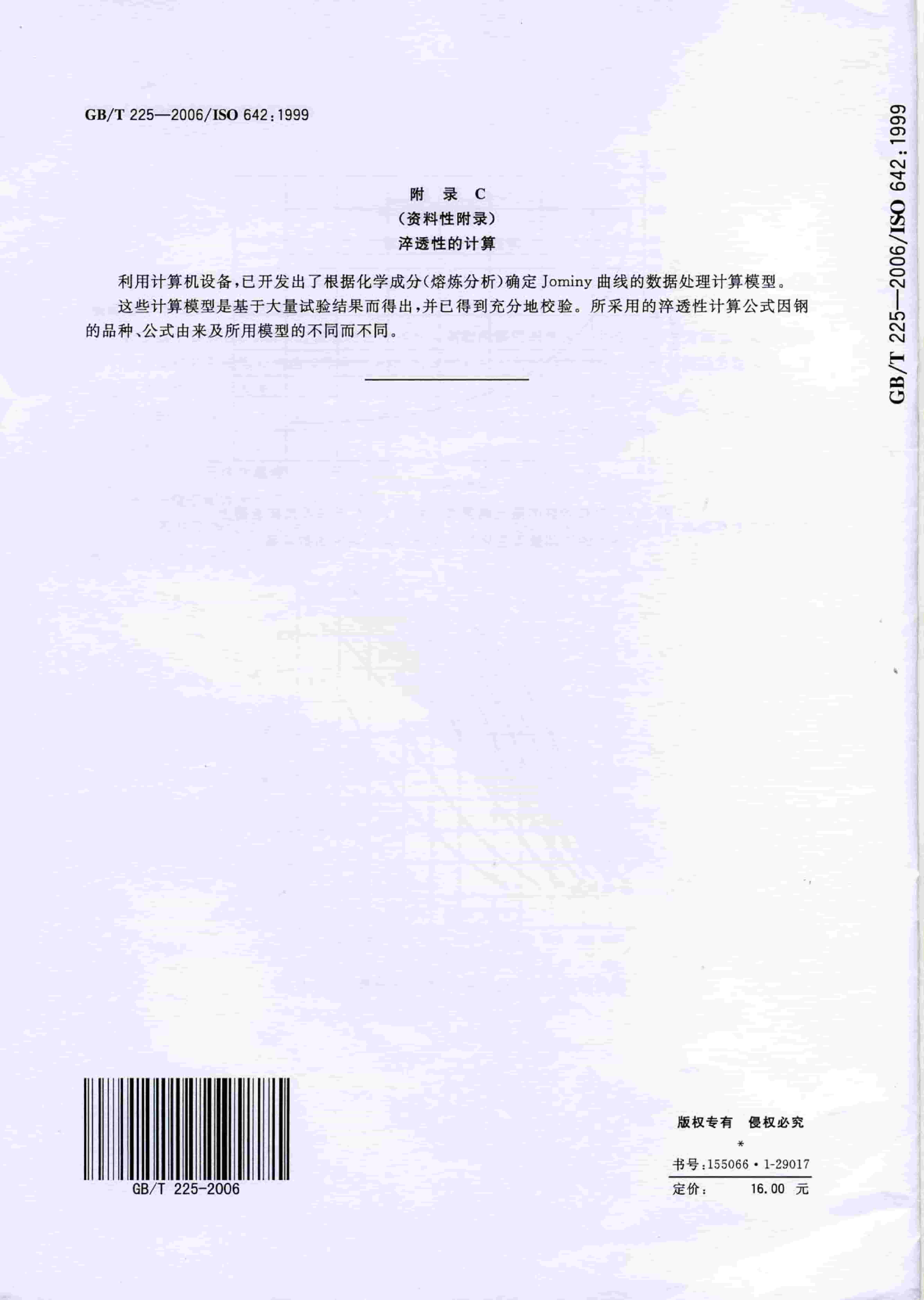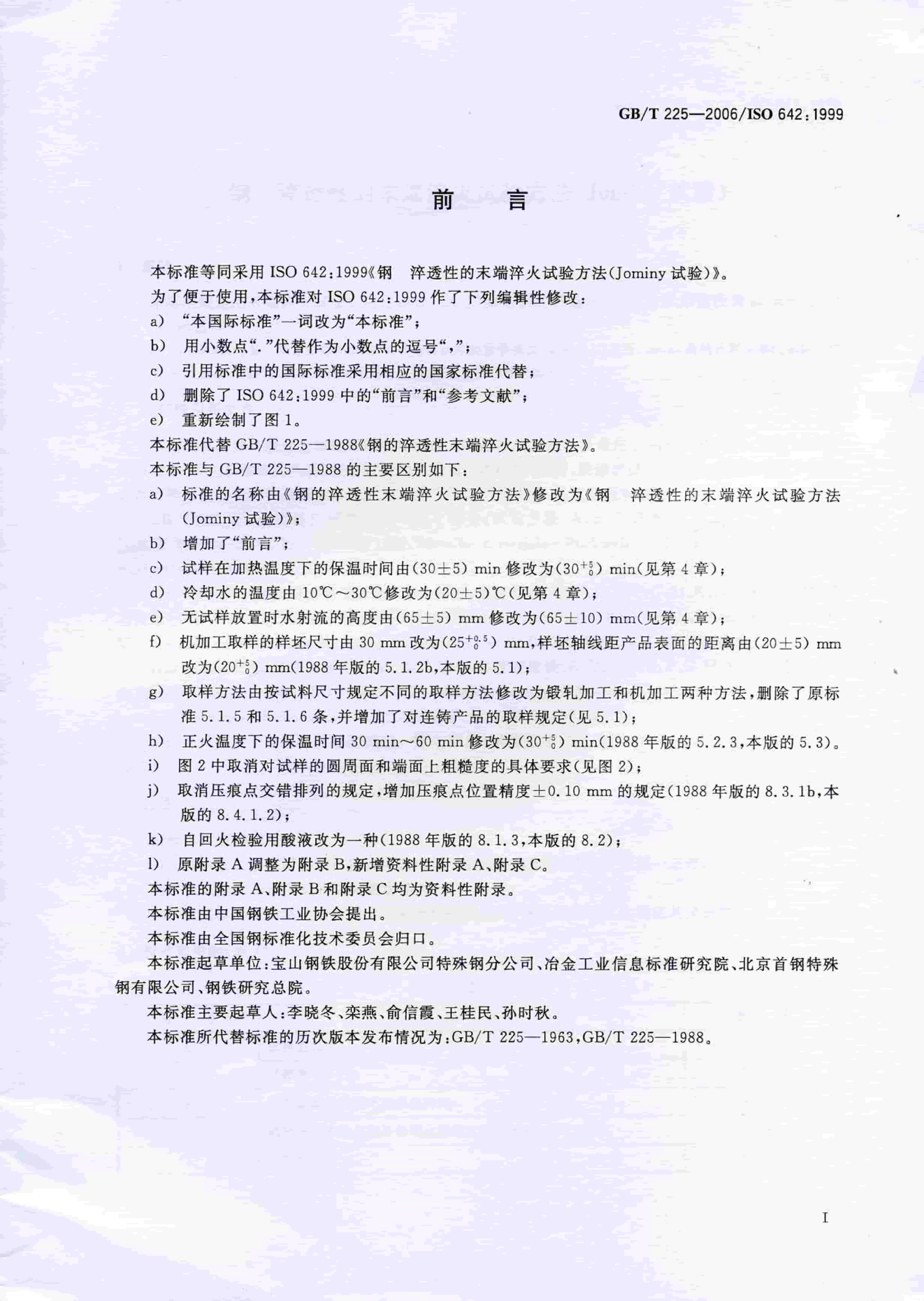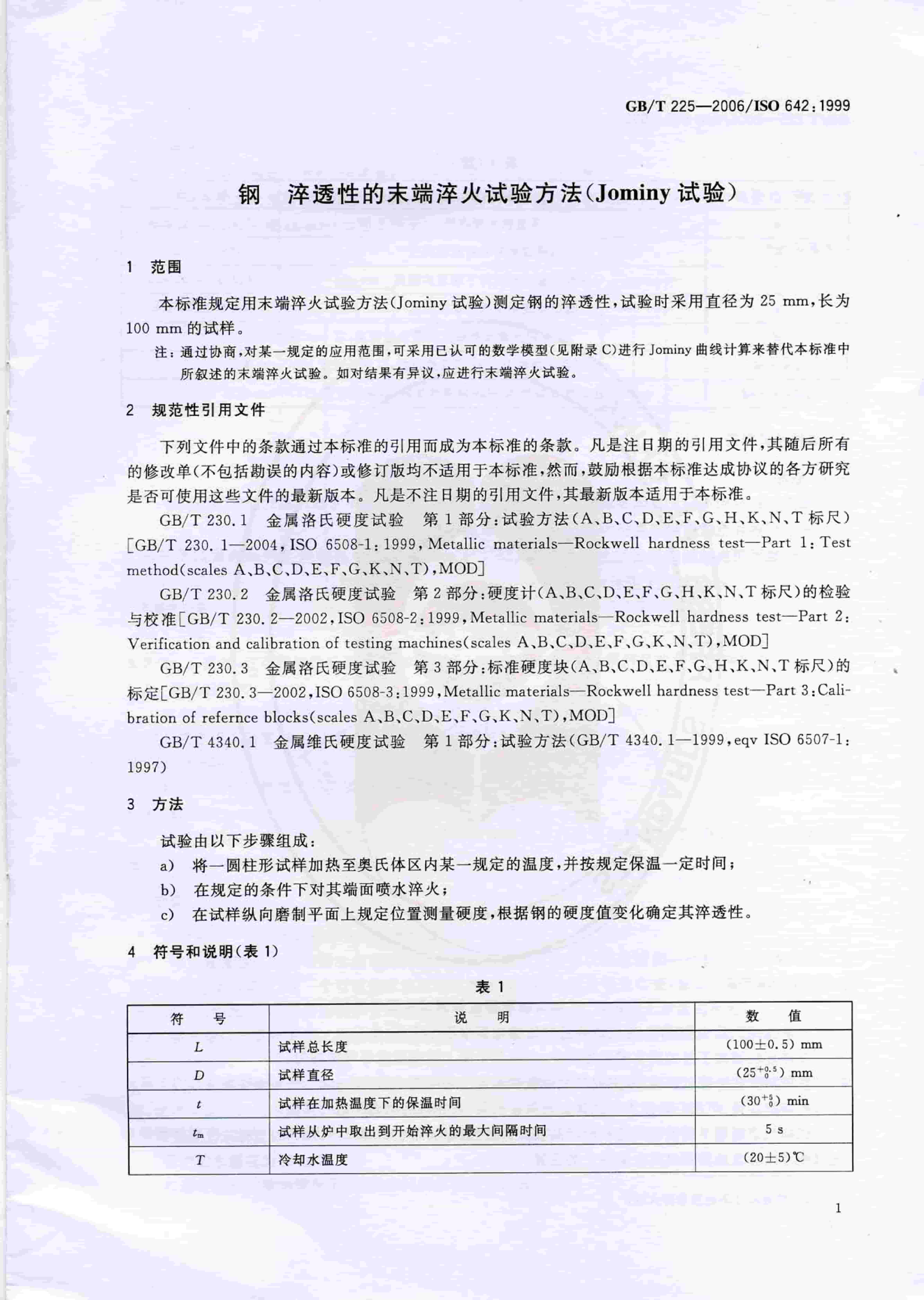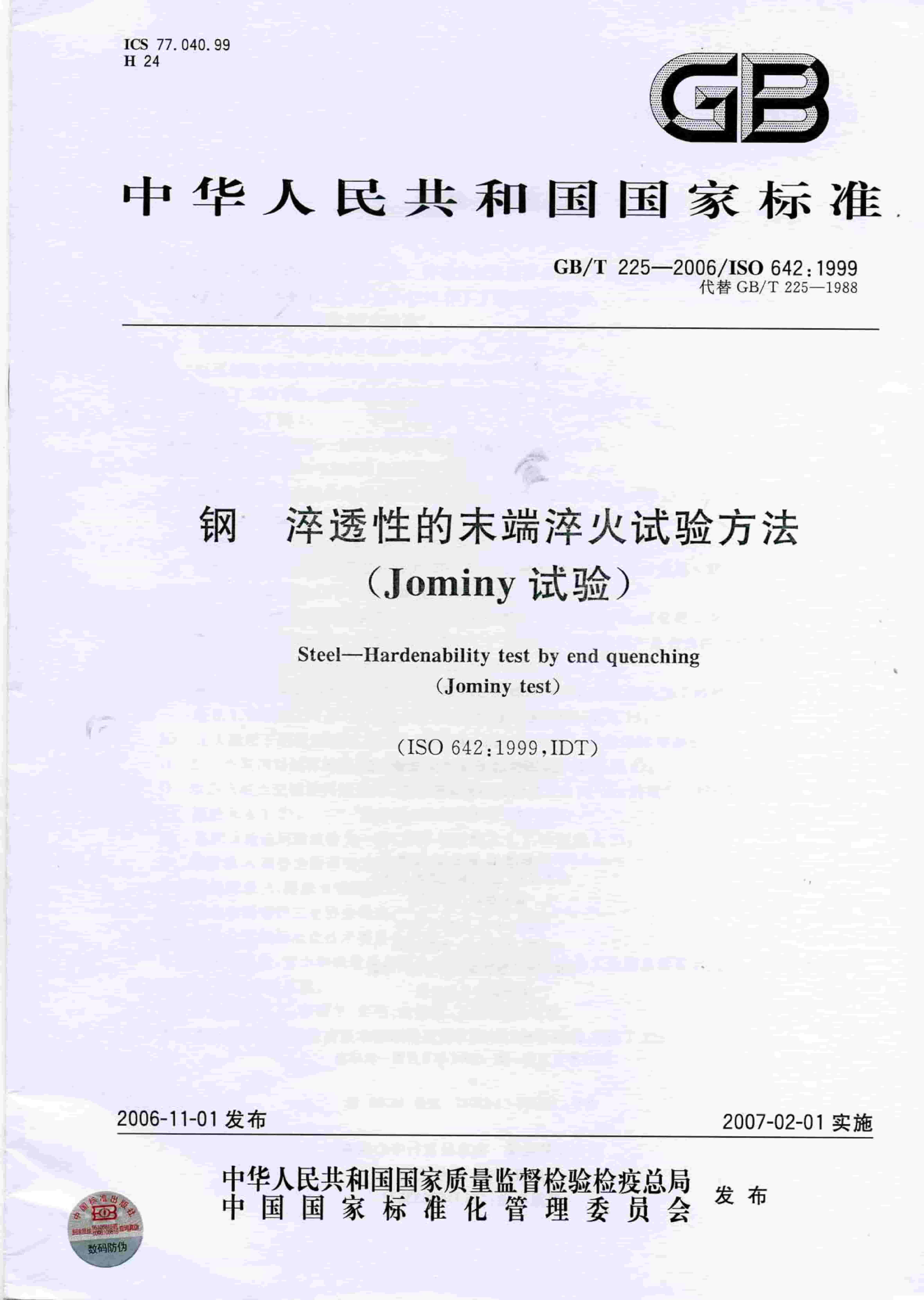 GBT 225-2006 鋼 淬透性的末端淬火試驗(yàn)方法(Jominy 試驗(yàn))